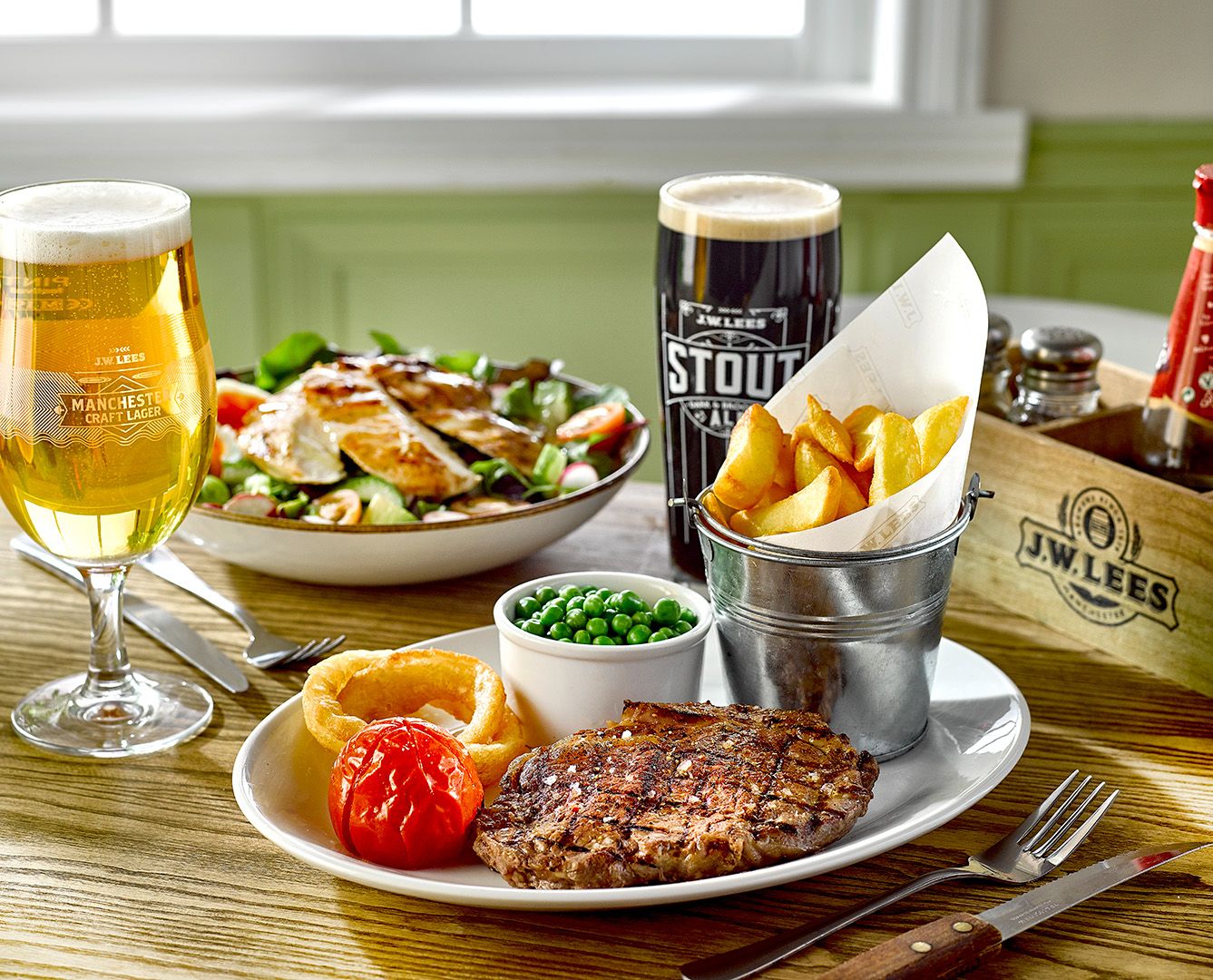 (V) – suitable for vegetarians, (VG) – suitable for vegans, (VGA) – vegan option available, (NGCI) – No Gluten Containing Ingredients, * Can be cooked without gluten. POA = Price On Application. Please ask your server for the price. lf you suffer from a food related allergy please inform a team member for advice before you order. Not all ingredients are listed on the menu & our kitchen uses nuts, gluten and other allergens. Although every care is taken to prevent cross contamination of allergens we cannot guarantee it. Should the listed product be unavailable due to circumstances affecting the supply chain it may be replaced by a similar alternative product. Fish may contain bones. Cooking oil may contain genetically modified ingredients. The calories listed are per serving, additional items to a dish (eg: sauces) are listed separately. Adults require around 2000kcal per day. Weights stated are uncooked and approximate. Prices are GBP. *MPA is our JW Lees Manchester Pale Ale; a golden ale brewed in Manchester entirely from all British malt.